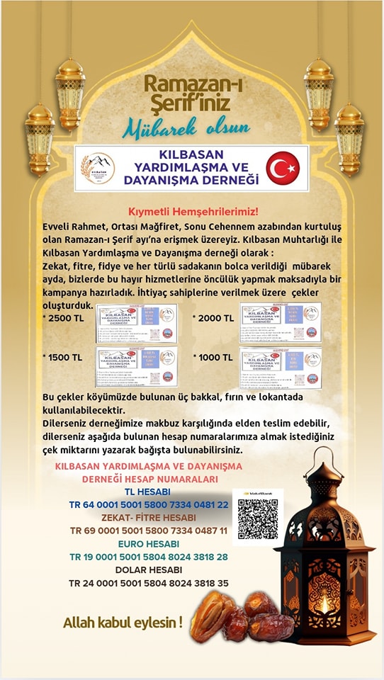 Köyümüzde hasta yatağına ihtiyaç duyan vatandaşlarımıza destek olmak amacıyla bağış kampanyası başlatmış bulunuyoruz. Sizlerin yapacağı her katkı, ihtiyaç sahibinin yaşamını kolaylaştıracak ve büyük bir hayır kapısı olacaktır. Derneğimiz bünyesine alınacak bağışlarla temin edilecek hasta yatakları, ihtiyaç sahibi vatandaşlarımızın kullanması amacıyla ücretsiz olarak teslim edilecek; kullanım süresi sona erdiğinde tekrar derneğimize iade edilerek ihtiyaç duyan diğer vatandaşlarımıza yeniden verilecektir. Bağış İBAN: TR64 0001 5001 5800 7334 0481 22 Kılbasan Yardımlaşma ve Dayanışma Derneği Yapacağınız yardımlar için tüm hemşehrilerimize teşekkür eder, dayanışma ruhunun devamını dileriz. Kılbasan Yardımlaşma ve Dayanışma Derneği